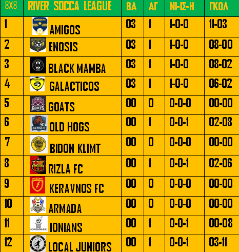 Δυο βαριά ονόματα δήλωσαν με την πρεμιέρα άγριες διαθέσεις στοχεύοντας καθαρά τον τίτλο αλλά και την ευρωπαϊκή πορεία! BLACK MAMBA και AMIGOS συναντάνε τους χειμερινούς πρωταθλητές, GOATS αλλά και την ενισχυμένη επιθετικά ENOSIS! Θα είναι η τετράδα των ημιτελικών που θα διεκδικήσουν τον τίτλο ή θα έχουμε κάποια έκπληξη από τις νέες ομάδες του τουρνουά (GALACTICOS, LOCAL JUNIORS, KERAVNOS, ARMADA) ή από τις παλιές OLD HOGS, BIDON KLIMT, RIZLA, IONIANS?