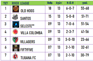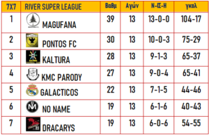 Σε δυο γκρουπ των 7 ομάδων τώρα οι ομάδες στην RIVER SUPER LEAGUE και την RIVER LEAGUE, με την κανονική ροή του πρωταθλήματος, σε δυο γύρους (12 αγωνιστικές) πριν τα play off. Μεγάλο το βαθμολογικό πλεονέκτημα για την MAGUFANA που αν το διατηρήσει εξασφαλίζει το πλεονέκτημα στους μονούς νοκ άουτ αγώνες που φέτος αφορά στην ισοπαλία (pass χωρίς παράταση ή πέναλτι για την ομάδα με την καλύτερη θέση στο πρωτάθλημα) αλλά και την ημέρα επιλογής του αγώνα .