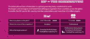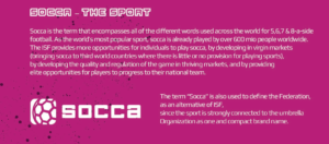 600 εκατομμύρια ερασιτέχνες παίκτες ασχολούνται με το ποδόσφαιρο μικρότερων διαστάσεων ανά τον κόσμο και η επωνυμία SOCCA της ISF θέλει να ενώσει όλους αυτούς σε μια χαρούμενη κοινότητα που χαίρεται το ποδόσφαιρο στο αγνό του χαρακτήρα.