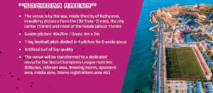 Το Σοχώρα Αρένα θα φιλοξενήσει τους αγώνες με την τοποθεσία του να βρίσκεται σε κοντινή απόσταση από το κέντρο του Ρεθύμνου και τα ξενοδοχεία που θα καταλύσουν οι αποστολές . Θα οργανωθεί όλο το γήπεδο ώστε να γίνει απόλυτα λειτουργικό για την διοργάνωση παρέχοντας αποδυτήρια, ζώνες διαιτητών και οργανωτικών επιτροπών ,  ζώνες τηλεοπτικής παραγωγής κλπ